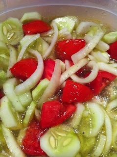 Place cucumbers, tomatoes, and onion in a large bowl; set aside.